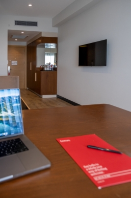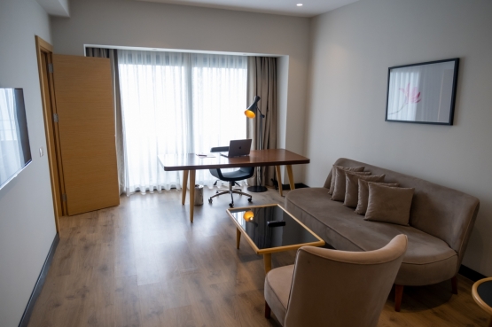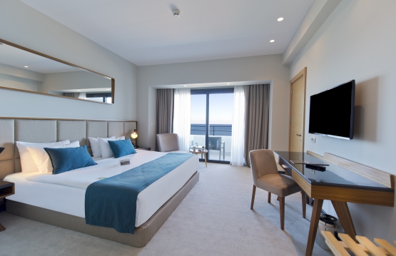 Konfor ve toplantı ihtiyaçlarınızı karşılayan, özel ekipmanlarla donatılmış ayrı toplantı bölümü ile 46 m² büyüklüğündeki doğa ve deniz manzaralı odalarımız, iki ayrı balkonlu, zemini halı olan odalar, içerisinde rahat bir oturma bölümü, toplantı masası, 2 kişilik geniş yatak, çay – kahve set up’ı, duş, iki ayrı tuvalet, merkezi klima sistemi, Smart LED IP TV, direkt aramalı telefon, banyolarda telefon, mini bar, 24 saat oda servisi, çalışma masası, ücretsiz Wi-Fi internet erişimi, elektronik kasa, saç kurutma makinesi, makyaj aynası, terlik ve yastık servisimiz vardır.
