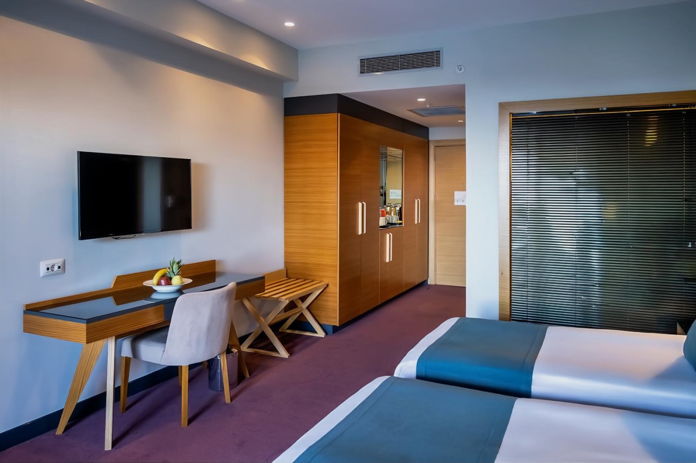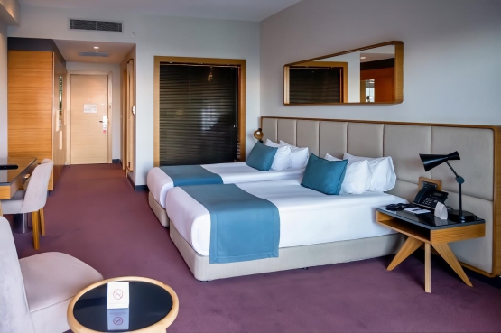 Bahçe manzaralıdır. 2 adet tek kişilik veya 1 adet çift kişilik geniş yataklı, çay- kahve set up’ı, Smart LED IP TV, balkon, duş, tuvalet, merkezi klima sistemi, direkt aramalı telefon, banyolarda telefon, mini bar, 24 saat oda servisi, çalışma masası, ücretsiz Wi-Fi internet erişimi, elektronik kasa, saç kurutma makinesi, makyaj aynası, terlik ve yastık servisimiz vardır. Ayrıca bağlantılı olarak da sunulan odalarımız 27 m² büyüklüğündedir.
