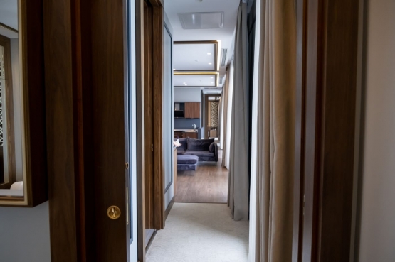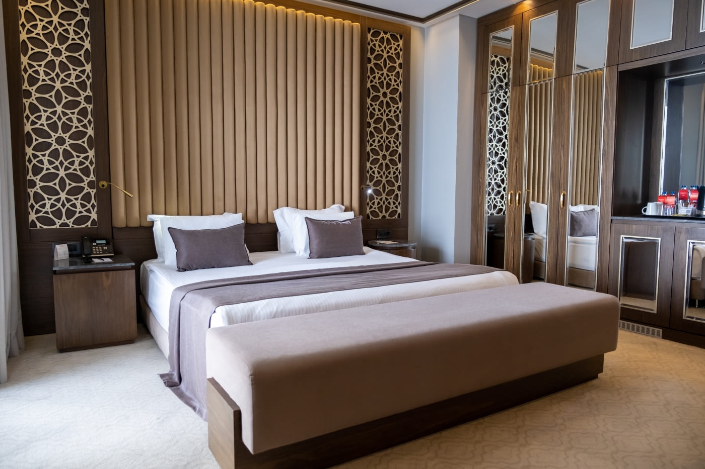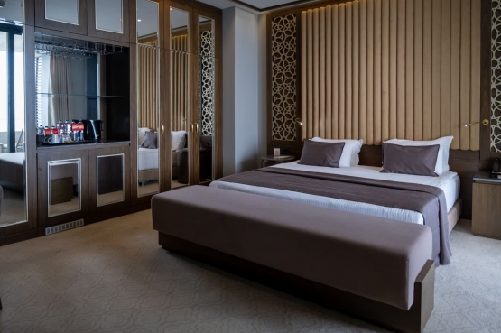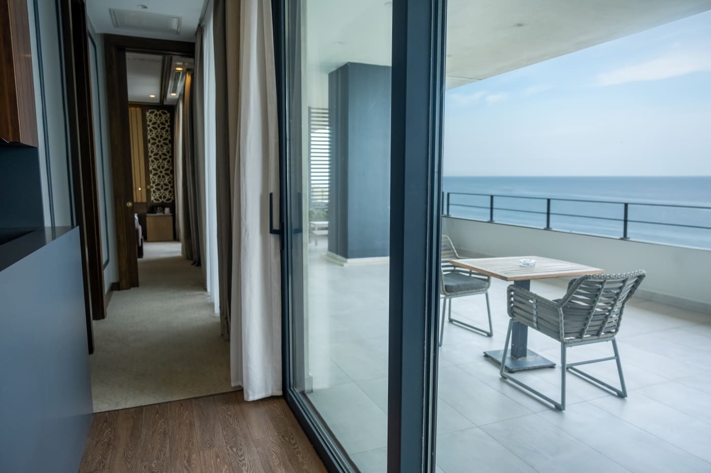 Konfor ve toplantı ihtiyaçlarınızı karşılayan, özel ekipmanlarla donatılmış ayrı toplantı bölümü, mutfak ve oturma alanı ile doğa ve deniz manzaralı odalarımız, iki ayrı balkonlu, zemini halı olan odalar, içerisinde rahat bir oturma bölümü, toplantı masası, koltuk ve oturma alanı, mutfak, 2 kişilik geniş yatak, çay – kahve set up’ı, duş, iki ayrı tuvalet, merkezi klima sistemi, Smart LED IP TV, direkt aramalı telefon, banyolarda telefon, mini bar, 24 saat oda servisi, çalışma masası, ücretsiz Wi-Fi internet erişimi, elektronik kasa, saç kurutma makinesi, makyaj aynası, terlik ve yastık servisimiz vardır.